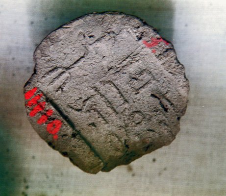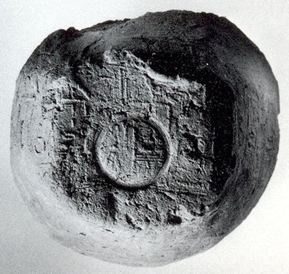 | In Elephantine wurden vier Gefäßverschlüsse in Form von Kegelstümpfen gefunden, deren Unterseiten die Abdrücke der Gefäßränder zeigen. Bei zwei der Exemplare fanden die Ausgräber auch Abdrücke von einer Deckelscherbe, die über die Gefäßöffnung gelegt worden war (Material: Nilschlamm mit Häcksel- und Kohlestückchenablagerungen) |