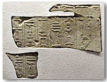 Fragment Weill 4 - Sitzender Gott Einige Forscher, wie Kurt Sethe , sehen in dem Fragment eines Schriftzeichens über dem Kopf des anthropomorph dargestellten Gottes unzweifelhaft den Rest eines "b" und ergänzen dieses dann zu [Gb] "Geb". (So auch zuletzt durch J. Kahl, Kloth und Zimmermann in "Die Inschriften der 3. Dynastie, ÄA 56, Wiesbaden 1995, S. 114-119), was dann von Sethe und seinen Nachfolgern für das ganze Monument bereits mit einer Darstellung der heliopolitanischen Neunheit gerechnet wurde, was aber anhand der spärlich vorhandenen Fragmente von Ludwig D. Morenz in ÄAT 33,3 bezweifelt wird und er stattdessen "als stimmige Möglichkeit die Ergänzung zu "nbw" anbietet, wobei in dem "Goldenen" - Nbw - im Relieffragment von Heliopolis die erste (erhaltene) Bild gewordene Personifikation des Sonnengottes vermutet wird. Bild: Hans