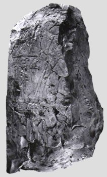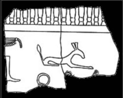 Die Kalksteinblöcke zeigen bemerkenswerte Darstellungen, deren Erhaltungszustand leider nicht besonders gut ist. In der Fachwelt werden die Darstellungen unterschiedlich gewertet. Die Darstellungen auf dem Fragment in Turin sind in zwei übereinander liegenden Register unterteilt. Die Trennlinie besteht aus einem Band das mit Sternen besetzt ist. Im oberen Register ist wohl der König mit weitausholendem Schritt (nach rechts schreitend) dargestellt. Er ist bekleidet mit der Phallustasche und trägt den Tierschwanz am Gürtel. In seiner rechten Hand hält er vier Pfeile. Der Raum hinter dem König ist in zwei übereinanderliegende Register unterteilt. Im oberen Register schreiten zwei Männer - in kleinem Maßstab dargestellt - hinter dem König, sie trugen wohl etwas in ihren Händen. Im Register darunter ist ein weiterer schreitender Mann in bedeutend größerem Maßstab, bekleidet mit einem Pantherfell, abgebildet. Über der Schulter trägt er die Utensilien eines Schreibers. Bei dieser Person handelt es sich damit wohl um einen Priester, der den König bei seinen rituellen Handlungen unterstützt.Vor dem Priester befinden sich die Hieroglyphen für Mut (Mwt) und eventuell ein nfr- Zeichen, was somit Mut-nefer bedeuten würde. Die gesamte Szene erinnert stark an die Darstellung auf der Narmerpalette. Im unteren Register, das vom oberen durch ein Sternenband getrennt ist, sind nur noch die Reste einer Bootsprozession zu sehen. Außerdem erkennt man noch den Namen Wnw, (nach Morenz (1994) ist eventuell damit die Göttin Wmw.t) gemeint. Die Szene könnte als das sog. "Horusgeleit" verstanden werden. Nach Morenz hatte das Horusgeleit möglicherweise einen Ort im Delta zum Ziel. Bei den Kalksteinfragmenten dürfte es sich eventuell um die äußere Verkleidung eines Bauwerks handeln (nicht um eine Stele wie Silvio. Curto oder G. Galassi dachten). Leider konnte von dem zugehörigen Bauwerk keine Spuren entdeckt werden. Morenz vertritt die Ansicht, es handle sich um Türpfosten, da es gerade diese Teile eines Gebäudes sind, die in Stein ausgeführt wurden. (Quelle: Nach Kemet Nr. 1 / 2014 – Autor: Robert Kuhn) |