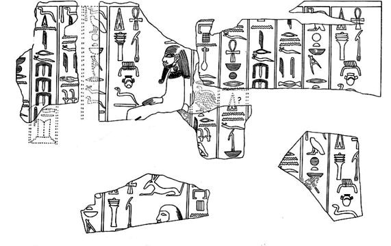 | Zeichnung u. Rekonstruktion nach R. Weill und W. S. Smith: A history of Egyptian Sculpture and painting in the Old kingdol 1946, fig. 48, 50-53 | Two fragments: Djoser reliefs from Heliopolis in Turin, altered from Weill's drawings by noes made in Turin (Weill, Sphinx 15, Fig. 1,20) |