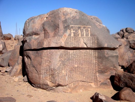 Wahrscheinlich ist die Inschrift der sog. "Hungersnotstele" eine Fälschung aus der ptolemäischen Zeit - wobei es zu einer genauen Datierung unter den Forschern leicht abweichende Absätze gibt. Barguet (1953) tendiert zu Ptolemaios V. und datiert die Niederschrift deshalb auf 187 v. Chr., andere Forscher wie Gabolde neigen dazu, die Abfassungen auf der Stele unter Ptolemaios VIII. Euergetes II. sowie Ptolemaios IX. Soter (Sethe 1901 und Grenier 2004) anzusetzen.