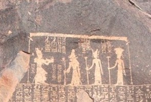 | Der Name König Djoser erscheint auf einer Inschrift aus dem Wadi Maghara im Sinai. Ein Relief zeigt ihn wie er einen Gefangenen erschlägt. Mit der Keule holt er zum todbringenden Schlag aus. Der Feind ist wahrscheinlich aufgrund seiner Haartracht als Asiate zu identifizieren - obwohl bis ins Alte Reich hinein, der Feind selbst stets namenlos bleibt. Hinter dem König steht eine Göttin, die ein Was-Zepter in der linken Hand hält und ein Anch-Zeichen in der Rechten. |
