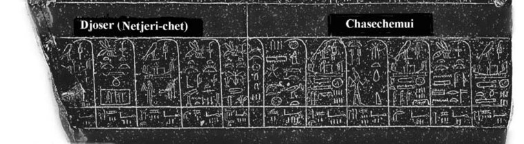 | 1. | Chasechemui stirbt am 23. Tag des 2. Monats im Jahr; Lt. einer Inschrift auf dem Turiner Königspapyrus (siehe Siegfried Schott, Altägyptische Festdaten, S. 54) ist die Regierungsübernahme König Djosers vom 26. Achet III. belegt. Djoser wird gekrönt und erscheint wie "die aufgehende Sonne" als König von Oberägypten; danach erscheint er als König von Unterägypten und vereinigt die beiden Länder unter seiner Herrschaft und "umschreitet die Weiße Mauer" (siehe dazu: weiter unten unter "Allgemeines zu den Eintragungen auf dem Annalenstein") |