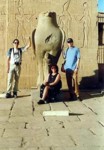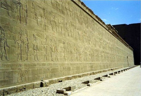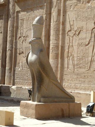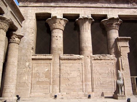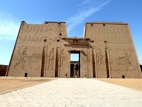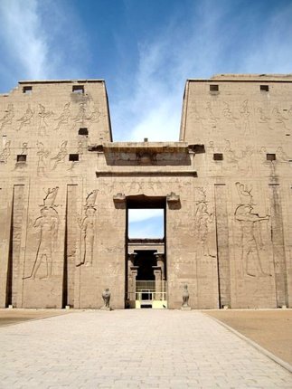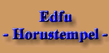 Die Tempelanlage von Edfu: Der Tempel des Horus befindet sich auf einer nord-südlich symmetrisch ausgerichteten Achse, auf der das Eingangsportal im Süden mit dem Allerheiligsten im Norden verbunden ist. Der Tempel bedeckt ohne seinen Pylon eine Fläche von 125,84 m x 47,22 m (Quelle: Diss. Ulrike Fauerbauch - der große Pylon des Horus-Tempels von Edfu, 2005). Der Pylon selber hat eine Höhe von 36 m und eine Breite von 64 m (nur der 1. Pylon von Karnak ist größer). Der Tempel ist dem falkengestaltigen Gott Horus geweiht, der Hathor von Dendera sowie einem jugendlichen Horus (Harsomtus).