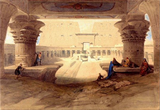 Diese Bild- oder Mediendatei ist gemeinfrei, weil ihre urheberrechtliche Schutzfrist abgelaufen ist. Dies gilt für die Europäische Union, Australien und alle weiteren Staaten mit einer gesetzlichen Schutzfrist von 70 Jahren nach dem Tod des Urhebers. Dieses Werk ist gemeinfrei in den Vereinigten Staaten, weil es vor dem 1. Januar 1923 veröffentlicht wurde (Quelle: dt. Wikipedia)Erst während der französischen Expedition nach Ägypten drangen die ersten Europäer im Jahre 1788 in den Tempel von Horus ein. Zu der Zeit waren die hinteren Räume des eigentlichen Tempels noch voll von Erde und Schutt. und die wenigen freien Räume waren von Arabern bewohnt. "Ein Teil der Einwohner des Dorfes hatte seine Wohnungen im Inneren des Tempelhofes aufgeschlagen". Die Araber lebten zwischen den Säulen und Skulpturen mitsamt ihrem Vieh. Sogar auf dem Tempeldach befanden sich Hütten.