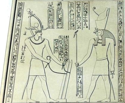 Triumph des Horus über Seth Auf dieser Darstellung nimmt der König aktiv an den Ereignissen des Kampfes teil. Er steht links im Bild vor der Götterbarke des Horus. Horus spricht zu ihm: Wir wollen jenen Feigling (Seth) mit unseren beiden Harpunen erstechen." Hinter Horus steht seine Mutter Isis und hebt schützend die Hand. Sie spricht: "Ich festige dein Herz, mein Sohn Horus, packe das Nilpferd, den Feind deines Vaters!"