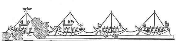 Triumph des Horus über Seth PM 160 (308-311) 2. Register Horus und Re in einer Barke. Vor ihnen die gebundenen Feinde in verschiedener Gestalt. An Land steht ebenfalls ein eine Horusgestalt, die einen Speer in den Händen hält. |