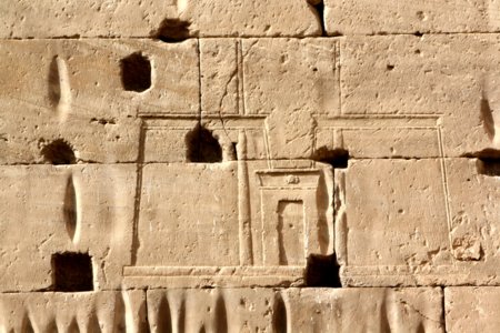 rekonstruierte Tempelfassade Beiderseits des Portals standen in den Einschnitten vier Flaggenmaste, die in den Öffnungen darüber verklammert waren. Die Fahnenstangen aus Tannenholz, die mit Kupfer aus dem Gebirgsland beschlagen waren, reichten bis fast zum oberen Ende der Türme. Deutlich sind heute noch die Rillen zu sehen, in welche die Stangen eingefügt waren, und ebenso die Löcher für die Kupferklammern, mit Hilfe derer sie festgehalten wurden. |