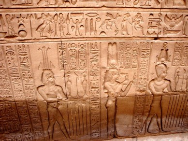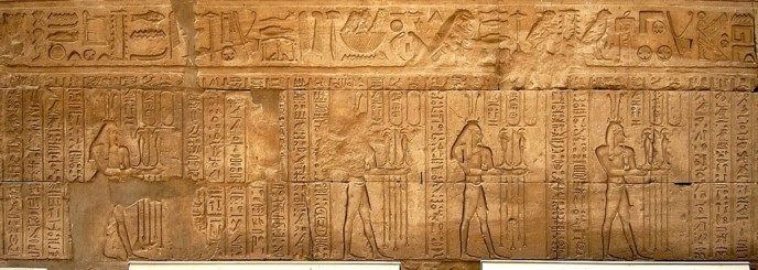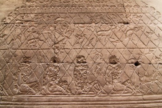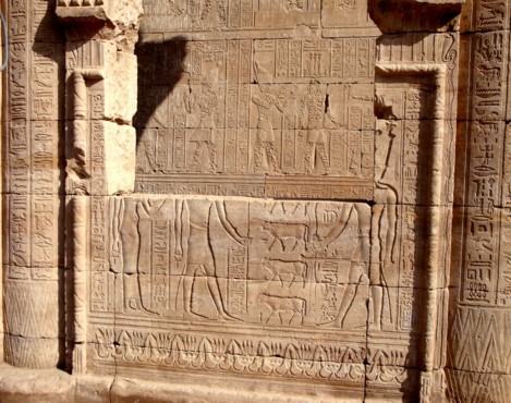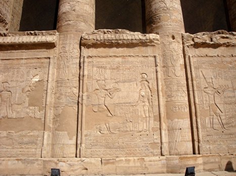 Das Mammisi von Edfu Relief auf den Wandschranken zwischen den Säulen.