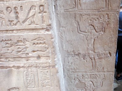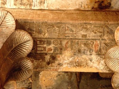 Die Darstellungen auf dem Architrav der Cella (Allerheiligstes) war zur Zeit der Lepsius-Expedition innen und auf dem oberen Teil ausgehackt und später dann wieder mit Gips gefüllt und mit roter Farbe beschrieben worden, aber bei der Besichtigung durch Lepsius war nur noch wenig davon zu sehen.