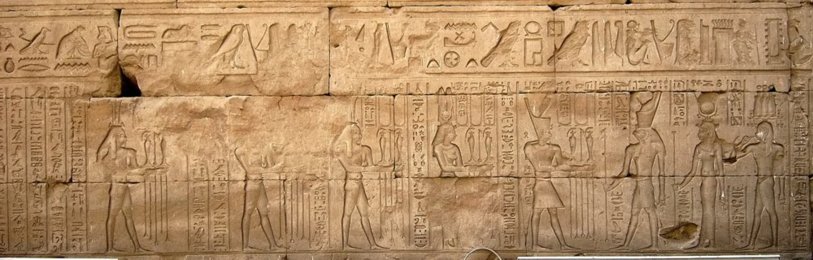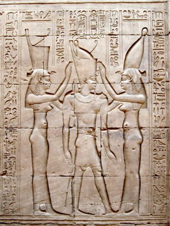 Diese Szenen haben ihren Ursprung im Neuen Reich. In dieser Epoche war die göttliche Geburt des Königs fester Bestandteil des Bildprogramms in den Tempeln. Dieser "Geburtsmythos" wurde in ptolemäischer Zeit von seinen Herrschern verändert und in allen Geburtshäusern der griechisch-römischen Zeit ersetzte nun die neue lokale Form des Kindgottes das vorher im Neuen Reich bestehende zentrale Königsmotiv. (Quelle: dt. Wikipedia / Tempel von Edfu)