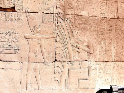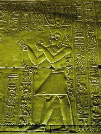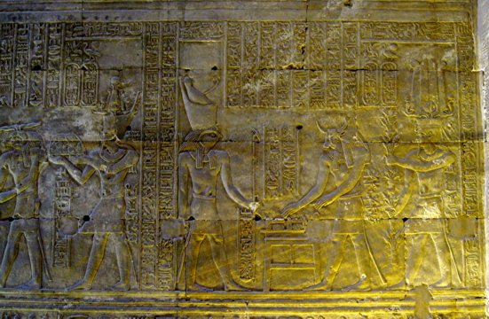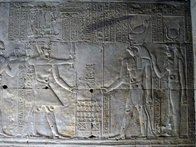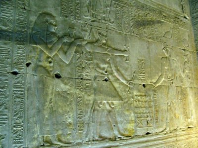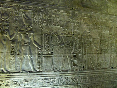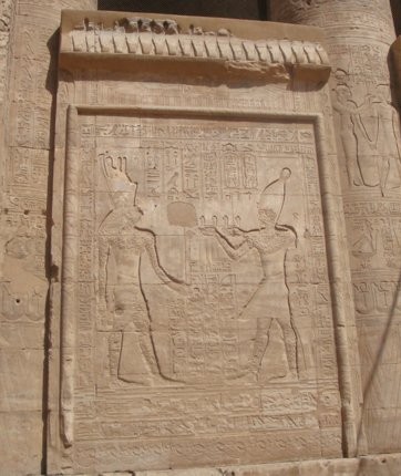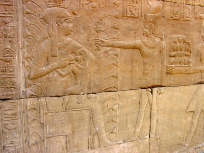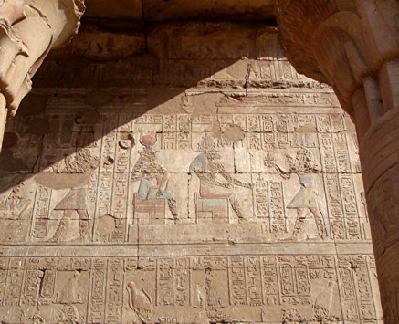Edfu-Tempel Mammisi - der König vor Hathor, die das göttliche Kind stillt. |