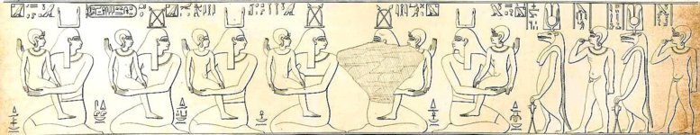 Lt. seinen Aufzeichnungen sitzen in der oberen Abteilung des Türsturzes abwechselnd 4 Männer und 4 Frauen, die sich "nach der Mitte umsehen", wobei jede der Personen ein Kind auf dem Schoß hatte - der äußerste Mann rechts den Horus, die folgende Frau den jungen König.