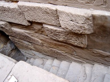 Beiderseits des über dem großen Eingangstores liegenden Architravs, befinden sich zwei große Blöcke, die mehrere "Fuß" (altes Längenmaß, das ca. 28 bis 32 cm entspricht) weit aus der Mauer ragen und auf denen je ein kleinerer in der Mitte ruht - wie Basen für Statuen (siehe Lepsius Textband Edfu S. 57). (Bild: Peter Alscher, Kümmersbruck) |