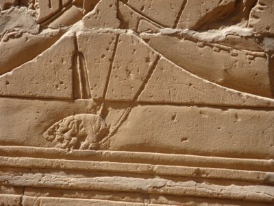 Triumph des Horus über Seth In den beiden Barken stehen Horus und ein mit Speer und Messer bewaffneter Schutzgott. Horus tötet mit einem Speer das Nilpferd, welches er an einem Strick hält. Dieser ist mit einer Harpune verbunden, die bereits vorher in den Leib des Tieres eingedrungen ist. Am Ufer steht der König - über ihm schwebt der Horusfalke.