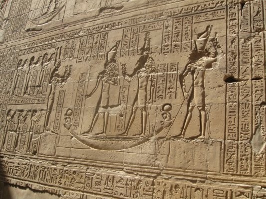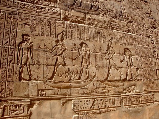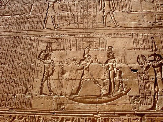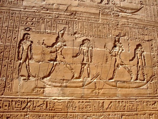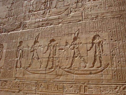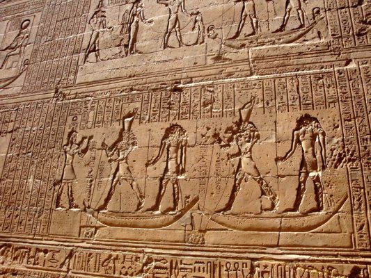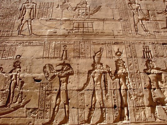 Triumph des Horus über Seth - Text nach: Ägypten, die Welt der Pharaonen, Schulz u. Seidel, S. 308 - Hinter der Barke steht Thot und rezitiert Texte aus der Festrolle. Hinter Thot steht Horus von Edfu und seine Mutter Isis. Horus trägt die Harpune. Durch das zweimalige Erscheinen von Gottheiten in einer Szene werden zumeist jeweils andere Aspekte des gleichen Gottes vergegenwärtigt. |