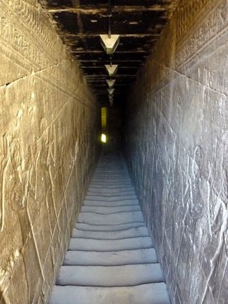 Der Zugang zum Haupttempel erfolgt von Süden her durch den Eingangs-Pylon, in dessen Inneren sich ein interessantes System von Treppen und Kammern befindet, die durch Lichtschlitze in der Fassade erhellt werden. Über eine Treppe von 145 Stufen gelangt man zur Terrasse mit ihrem höchst eindrucksvollen Rundblick. Wandkritzeleien von Soldaten aus der Armee Bonapartes "zieren" die oberen Zimmer (Quelle: Ägypten - die blauen Führer - Molden-Verlag).