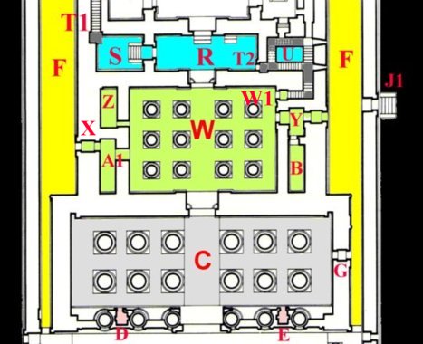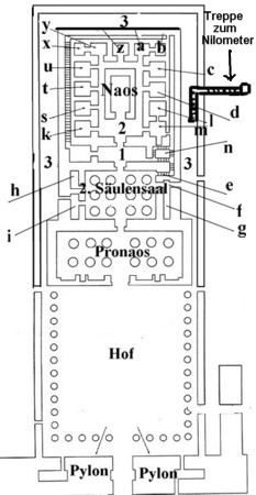 Grundriss des Edfu-Tempels 1) Zimmer der Opfer (Usechet hotep) 2) Zentraler Raum 3) großer Wandelgang |