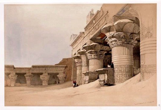 - Gemälde von David Roberts vom 24. Nov. 1838 -Diese Zeichnung von Roberts lässt erkennen, dass die Anhäufungen von Sand und Schutt den Tempel am Ende des 18. Jahrhunderts bis zu 10 Meter Höhe auffüllten. Diese riesigen Erdmassen musste Mariette bei seiner Freilegung im Jahre 1860 abtragen lassen, um das Heiligtum wieder zugänglich zu machen.