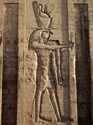 Die Tempelanlage war seit der griechisch-römischen Epoche dem lokalen Gott Horus geweiht, dessen Herkunftsangabe mit dem Zusatz "der von Behedet" (bHdt) angegeben wurde. Die ersten Belege für den Gott Horus in Edfu selbst stammen aus der Zeit des Mittleren Reiches. Er soll als Falkengott aus einem südlichen Land stammen und trug die Bezeichnung "Horus von Nubien im Gau von Edfu". In griechischer Zeit setzte man Horus mit Apollon gleich und der Ort Edfu trug die Bezeichnung "Apollinopolis Magna" (Quelle: KEMET Heft 1/2013, S. 25 Frank Müller-Römer). Der Sage nach war Edfu der Ort, wo der Falkengott Horus einen seiner größten Kämpfe gegen seinen ewigen Widersacvher Seth bestand.