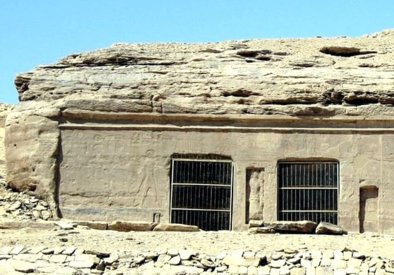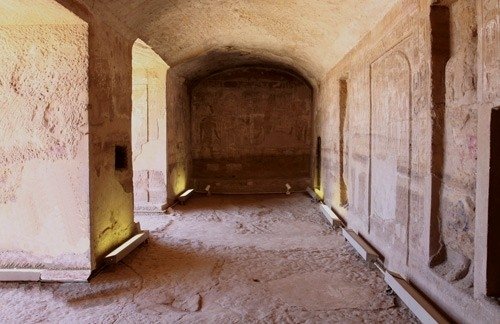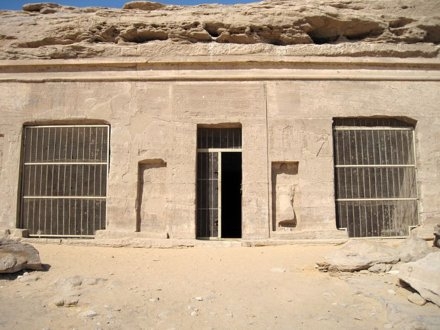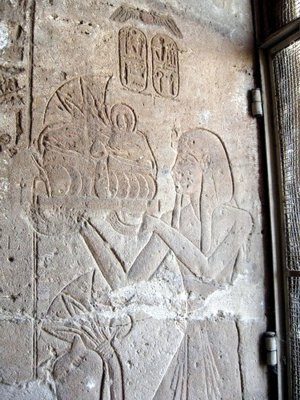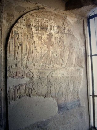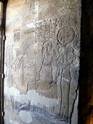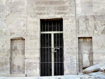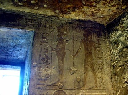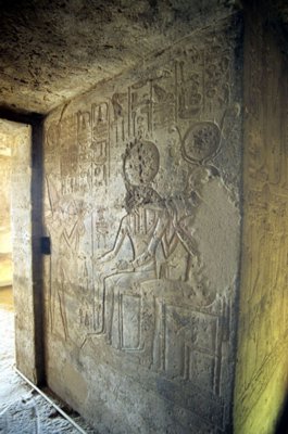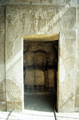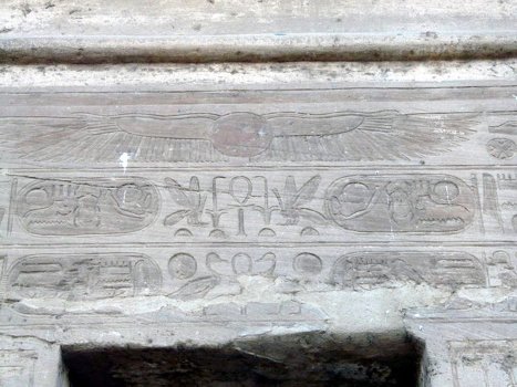 Auf dem Türsturz ist eine geflügelte Sonne und die Namenskartuschen des Pharao Haremhab zu sehen.
