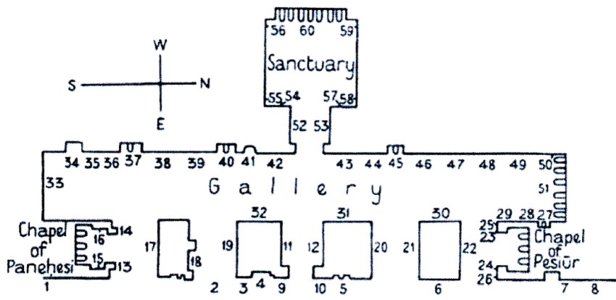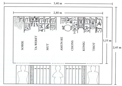 Dahinter folgt eine quergelagerten Halle und das zentral gelegene Sanktuar mit dem Kultbild von Amun, Mut und Chons, Sobek, Toeris, Thot und Haremhab.