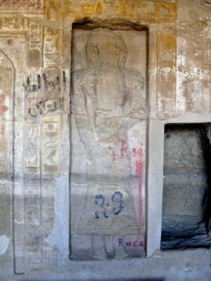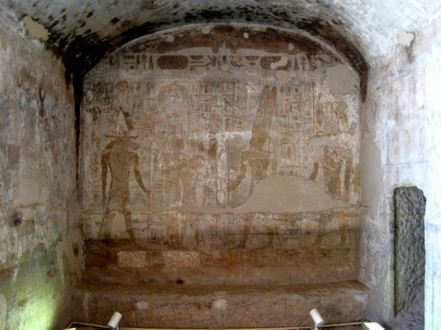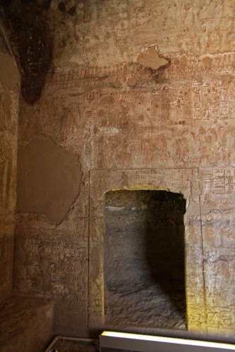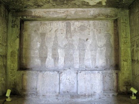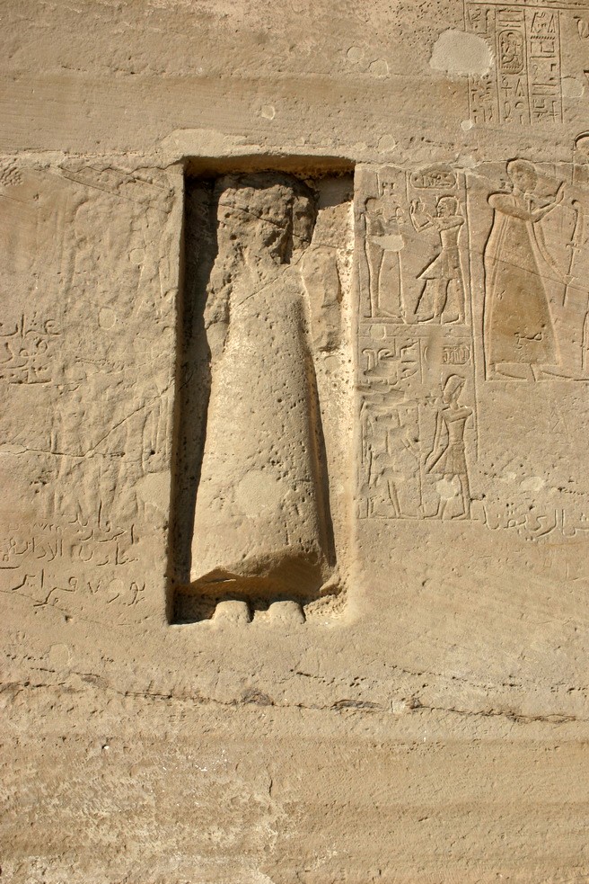 Es stellt sich nun die Frage, um wen es sich bei der halbplastischen Darstellung in der Nische handelt? Es ist unserer Meinung nach möglich, dass es sich um den oben gezeigten Wesir Neferronpet handelt, wozu auch das Gewand der Statue passen würde. Alternativ kämen noch der Wesir Parser II., der ebenfalls im Felstempel erscheint oder auch Chaemwese, der Sohn Ramses II. infrage.