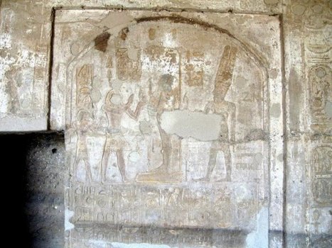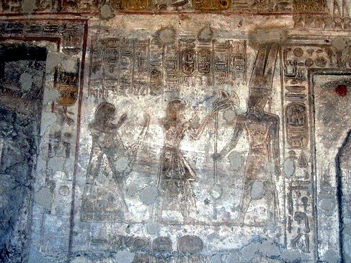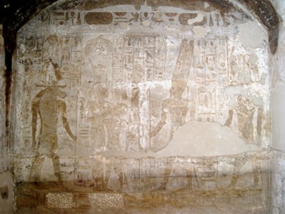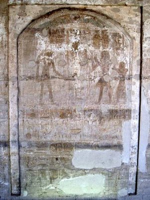 (PM 5) Diese Szene  über der Nische zeigt den Aufseher des Tempels Ramses III. in Medinet Habu namens Pairi, der in anbetender Haltung vor den Göttern Amun-Re, Sobek und Bastet steht.