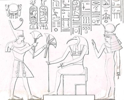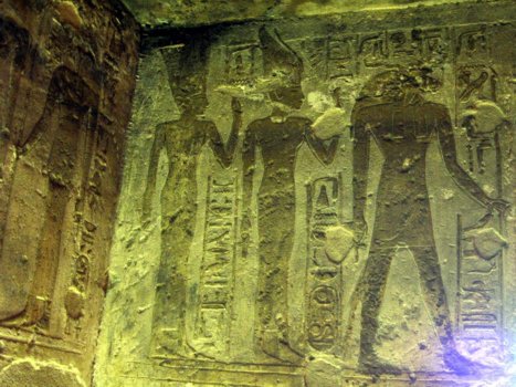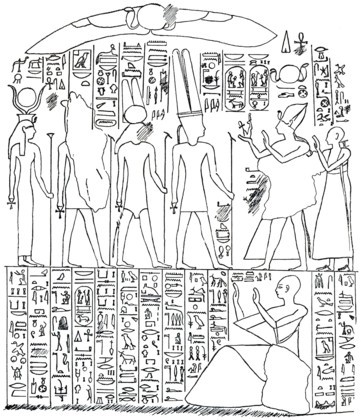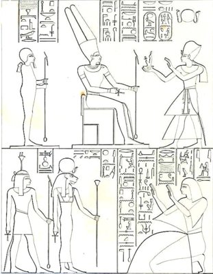 Im oberen Register sind die Götter Chnum, Satis und Anukis zu sehen.