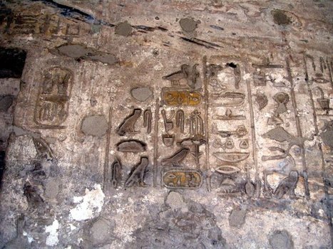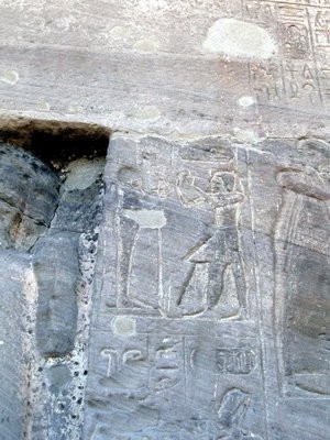 Rechts neben der Stele Ramses II.: Fünf Textzeilen des Prinz Chaemwese, darunter drei