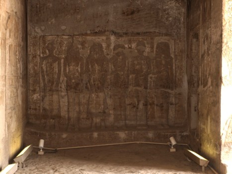 Die Statuen der Gruppe stehen nebeneinander aufgereiht in einer breiten, rechteckigen Nische in der Rückwand des Sanktuarraumes und sind direkt aus dem Fels, in dem sie noch weitgehend verharren, herausgearbeitet. Die Nische wird von einem schmalen Wandsteg (ca. 30 cm breit) umrahmt, der mit einer Inschrift des Königs versehen ist und die gesamte Wandfläche abschließt.