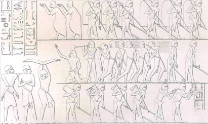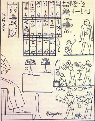 Darüber befindet sich eine Opferliste und davor in 3 Register Priester und Opferträger.