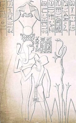 Darunter befindet sich in einer weiteren Szene - rechtes Bild - (Bildausschnitte vom Bild Dschabal as-Silsila Haremhab-Tempel 11 (siehe oben) ( unter PM 6), in der eine Frau, (evtl. eine Königin)  bekleidet mit einem langen Gewand, opfernd vor dem thronenden Gott Ptah steht. Hinter ihr steht eine weibliche Figur in kleinerem Format.