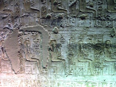 Lt. Porter u. Moss ( 1 ) befindet sich "ganz im Süden ein demotischer Text. Lepsius (a-a) gibt für das am Südende liegende Fassadenstück "ausgekratzt" an - ohne eine weitere Erklärung. Seltsamerweise geht weder PM noch Lepsius auf die großformatige Szene zwischen dem Südende der Fassade und ersten Tordurchgang ein. Die Szene ist zwar schlecht zu erkennen, aber unserer Meinung nach stand links der König, eventuell mit der "Blauen Krone" auf dem Haupt vor einem rechts stehenden Gott.
