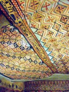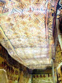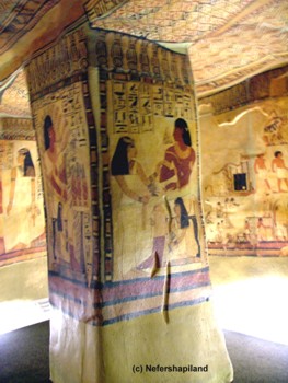 Diese Sarkophaghalle ist selbst ein fast quadratischer Vierpfeilersaal, dessen Deckenbemalung mit den geflochtenen Matten wie ein luftiges Zelt wirkt, durch das sich wie in der Vorkammer, die als Weinlaube bemalt ist, eine Weinranke zieht.