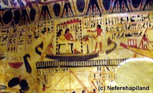 Ein weiterer wichtiger Themenkomplex in der Sargkammer beschreibt die symbolische Reise der Verstorbenen nach Abydos, der "heiligen Stadt", in der sich nach dem alten Glauben das Grab des Osiris befand. Diese Pilgerfahrt ist auf dem nördlichen Ende der Westwand dargestellt. Die Statuen von Sennefer und Meryt sitzen unter einem Baldachin auf einem grün bemalten Bestattungsboot zusammen mit einem Priester, der den Reinigungsritus vollzieht. Die Farbe "Grün" symbolisiert hier den Papyrus und im übertragenen Sinne die Wiedergeburt.