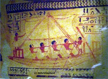 Ein größeres Boot, welches von Ruderern angetrieben und von einem Kapitän gesteuert wird, zieht die grüne Barke in nördliche Richtung. Im darunter liegenden Register ist die Rückreise in die Nekropole von Theben beschrieben. Das Boot, welches die grüne Barke zieht, hisst ein rechteckiges Segel als Hilfe für die Ruderer auf ihrem Heimweg stromaufwärts nach Theben.