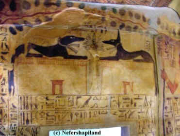 Ganz unten, in der Mitte liegt ein Schakal, das "Tier" des Anubis, auf einem Postament. Vier magische Ziegel kommen noch dazu, die den Verstorbenen nach allen Himmelsrichtungen hin beschützen sollen und zum Abschluss werden all die hier genannten Dinge durch den Spruch 151 des Totenbuches erläutert.