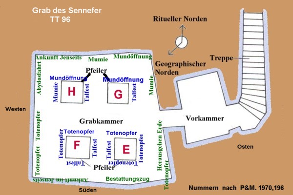 Da sich das Totenreich der Ägypter im Westen befindet, erfolgt jede Bewegung in das Grab hinein von Osten nach Westen. Dabei unterscheidet sich die "kultische Himmelsrichtung" sehr oft von der "geographischen Himmelsrichtung", d. h. somit liegt der Eingang sowohl des Kult- als auch des Jenseitsbereiches im "Osten" und die Kultnische der Kultkammer im "Westen". Man betritt danach die verschiedenen Grabbereiche also immer von "Osten". ( rechts ist dann Norden - links "Süden")