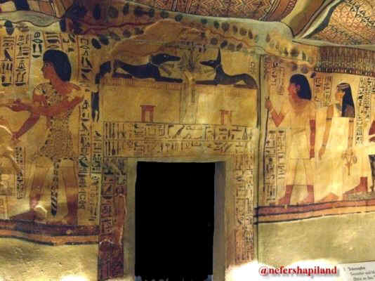 Die Malereien des Grabes umfassen drei Hauptthemen: der Weg zur Totenstadt, die Wiederherstellung des Köprers und die Wiedergeburt. Oben an den Wänden in diesem Teil des Grabes laufen Chekerfriese entlang, welche der Unterwelt zugehörig sind. Der als nördlich betrachtete Teil - der Horizont der neugeborenen Sonne - wird dagegen von Rebstöcken geschmückt, sowie von den zwei göttlichen Augen (Sonne und Mond), welche als Symbole der Ewigkeit betrachtet werden.