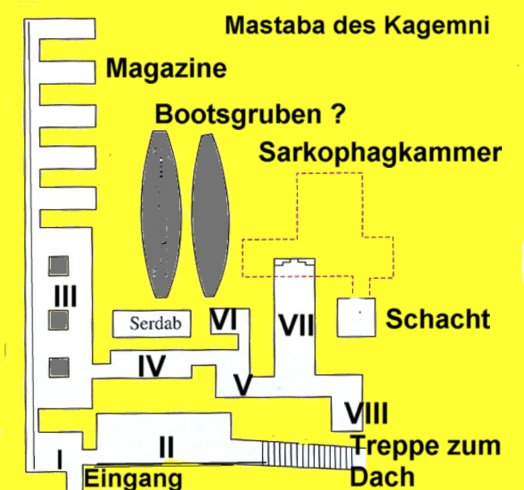 Nicht weit von den Räumen VII. und VIII. - in der nordwestlichen Ecke der Mastaba befand sich in der massiven Mauerstruktur - also in der Nähe des Opferraumes durch den Boden verbunden, der Grabschacht, der in die unterirdische Grabanlage führt. Diese war nur für den Grabinhaber bestimmt und nach der Bestattungszeremonie hatte niemand mehr Zutritt dazu. In dieser unterirdischen Konstruktion, welche die Form eines umgedrehten "T" hatte, befand sich der Sarkophag des Kagemni.
