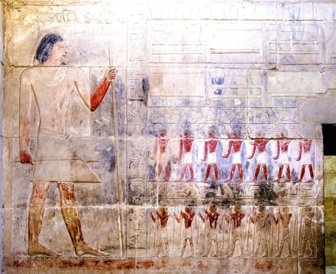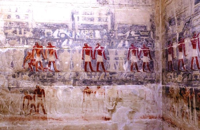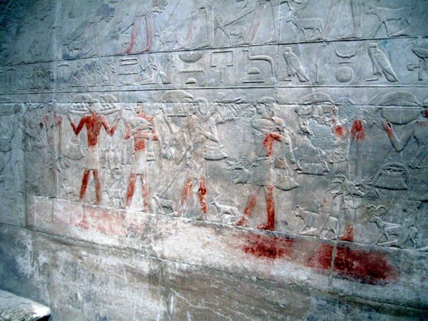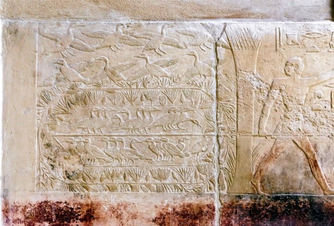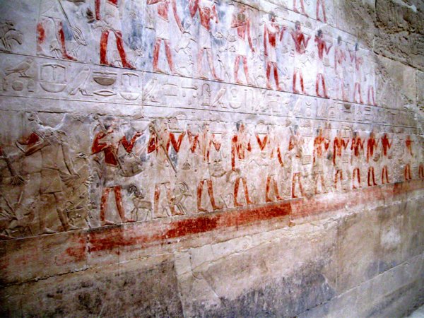 Die Wände der Mastaba sind auch heute noch sehr farbenfroh. Die Darstellungen zeigen vorwiegend landwirtschaftliche Szenen - Bauern bei der Ernte, Pflanzen und Tiere sowie Meref-nebef selbst mit seinen Frauen und Söhnen.