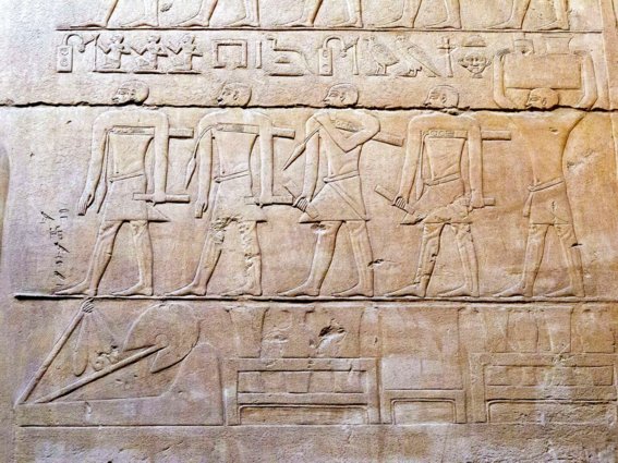 Vor ihm  sind in den beiden unteren Registern zwei Reihen von Männern (Träger) zu sehen, die sich auf ihn zubewegen. Die Träger im unteren Register halten in jeder Hand einen langen, schwer zu identifizierenden Gegenstand - der evtl. lange aufgewickelte Stoffrollen (?) sein können (3). Die Träger im zweiten darüberliegenden zweiten Register scheinen große Gefäße, evtl. Vasen (?) zu tragen. Beide Register sind durch eine Inschriftenzeile voneinander getrennt.