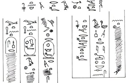 Dreispaltige Inschrift aus Felsrelief Wadi Maghara In der hier als Umzeichnung dargestellten Inschrift des benachbarten Felsreliefs aus dem Wadi Maghara auf dem Sinai befindet sich rechts der Horusname (D) des Chufu/Cheops. Auf dem "Serech" befindet sich der Horusfalke, im oberen Feld der Palastfassade wird der Horusname "mDdw" (Beckerath Handbuch) wiedergegeben. Links daneben steht der unvollständige Nebti-Name (C) "MDd-r-nbtj" [Medjed er Nebti = Der (die Feinde) zerdrückt, entsprechend den beiden Herrinnen" / nach Schneider]. In der Bildmitte (A) befindet sich der in eine Königskartusche geschriebene Geburtsname des Königs (hier in der Kurzform "Chuiefui" / allgemein als "Chufu" [er beschützt mich / nach Lexikon der Pharaonen] gelesen. |