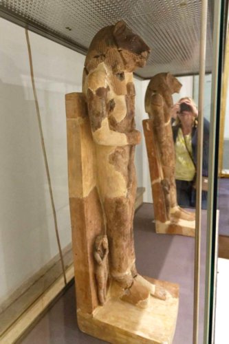 Oberkörper einer katzenförmigen Göttin Im Roemer- u. Pelizaeus-Museum in Hildesheim befindet sich das Fragment eines Gruppenbildes mit einer katzenförmigen Göttin aus Alabaster, von dem sich nur der Oberkörper erhalten ist. Der Fundort ist unbekannt. Die Hauptbruchstelle verläuft in Höhe der Taille und fällt dann schräg in Richtung Rückenplatte ab. Die Haltung des rechten Armes und und die Reste der dünnen, deutlich abgesetzten Rückenplatte machen deutlich, dass es sich hier um eine Gruppenstatue handelt. Die katzenförmige Göttin (evtl. Bastet oder Sachmet) ist bekleidet mit einem eng anliegenden Frauengewand, welches einst farbig bemalt war. Sie trägt eine dreigeteilte Perücke. Mit ihrer linken Hand umfasst die Löwengottheit den König, der nicht mehr erhalten ist. Wahrscheinlich betrug die ursprüngliche Gesamthöhe der Gruppenplastik ca. 105 cm (ca. 2 Ellen), was aber von der Höhe der nicht mehr vorhandenen Basisplatte abhängig ist. Die heutige Höhe beträgt 44,8 cm - Breite 23,5 cm - Material: Kalzit-Alabaster |