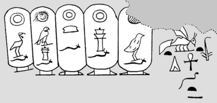 Über dem König schwebt ein Falke, darunter befinden sich die Hieroglyphen für „Schutz, Leben und (Frische??)." |