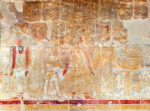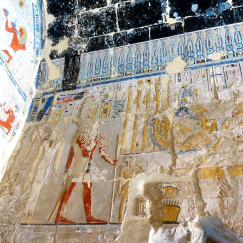 Eine fast identische Szene befindet sich auf der Südwand des Barkenraumes, wo die ganze Familie der Königin Hatschepsut abgebildet ist - die Lebenden und die Verstorbenen.