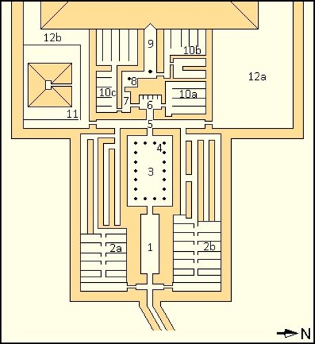 9) Opferhalle 10a-c) Magazine 11) Kultpyramide 12a+b) Pyramidenhof