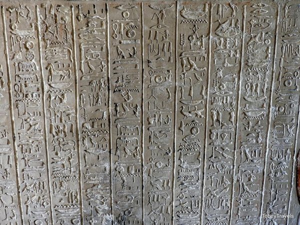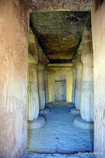 Bei dem Statuenpaar an der Rückseite der Kapelle, das zum Glück gut erhalten ist, handelt es sich um den Grabherrn und seine Gemahlin. Die Statuen wurden genau gegenüber dem Eingang aus dem Felsen gehauen, ,damit das einfallende Tageslicht sie hell erleuchtete.