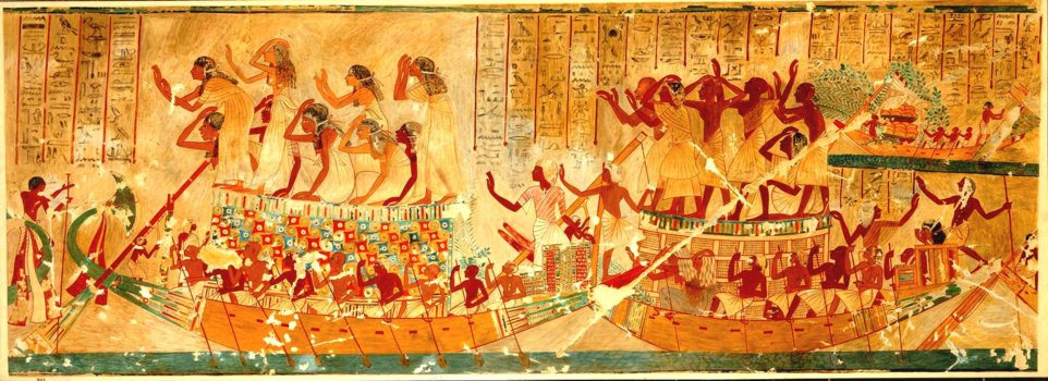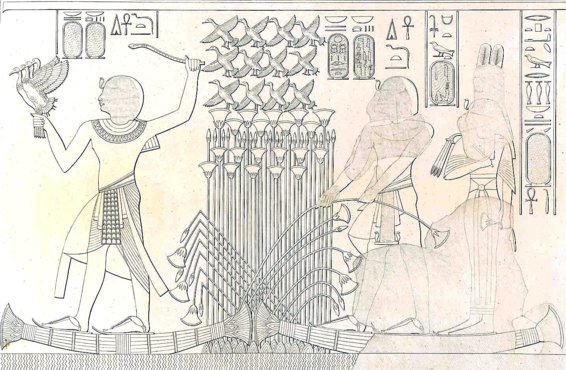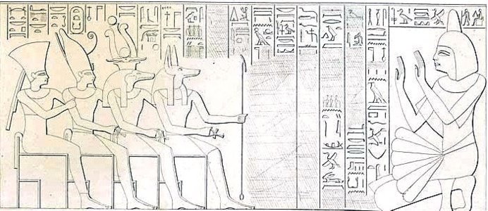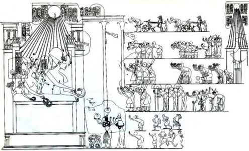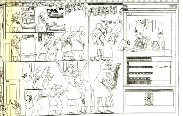 Klagefrauen - oben die Hathor-Kuh, welche den König schützt sowie der Grabherr und seine Familie